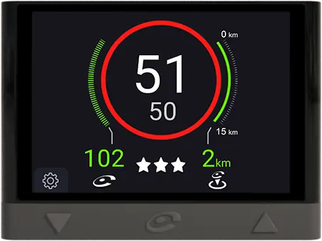 Alerta de incidencias en la carretera como accidentes, estrechamientos, tráfico, obras en la vía…, incluye más de 30 alertas diferentes. Además, muestra la velocidad máxima permitida y la velocidad a la que se circula, para ayudarte a respetar los límites. Es compatible también para motos